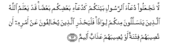 63. La tajAAaloo duAAaa alrrasooli baynakum kaduAAa-i baAAdikum baAAdan qad yaAAlamu Allahu allatheena yatasallaloona minkum liwathan falyahthari allatheena yukhalifoona AAan amrihi an tuseebahum fitnatun aw yuseebahum AAathabun aleemun
