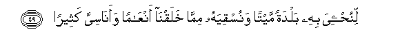 49. Linuhyiya bihi baldatan maytan wanusqiyahu mimma khalaqna anAAaman waanasiyya katheeran