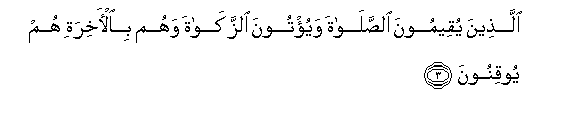 3. Allatheena yuqeemoona alssalata wayu/toona alzzakata wahum bial-akhirati hum yooqinoona