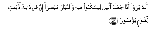 86. Alam yaraw anna jaAAalna allayla liyaskunoo feehi waalnnahara mubsiran inna fee thalika laayatin liqawmin yu/minoona