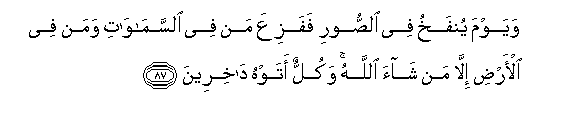 87. Wayawma yunfakhu fee alssoori fafaziAAa man fee alssamawati waman fee al-ardi illa man shaa Allahu wakullun atawhu dakhireena