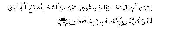 88. Watara aljibala tahsabuha jamidatan wahiya tamurru marra alssahabi sunAAa Allahi allathee atqana kulla shay-in innahu khabeerun bima tafAAaloona