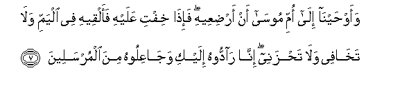 7. Waawhayna ila ommi moosa an ardiAAeehi fa-itha khifti AAalayhi faalqeehi fee alyammi wala takhafee wala tahzanee inna raddoohu ilayki wajaAAiloohu mina almursaleena