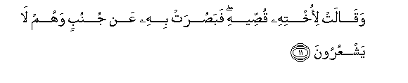 11. Waqalat li-okhtihi qusseehi fabasurat bihi AAan junubin wahum la yashAAuroona