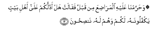 12. Waharramna AAalayhi almaradiAAa min qablu faqalat hal adullukum AAala ahli baytin yakfuloonahu lakum wahum lahu nasihoona
