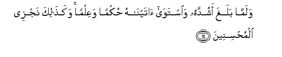 14. Walamma balagha ashuddahu waistawa ataynahu hukman waAAilman wakathalika najzee almuhsineena