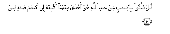 49. Qul fa/too bikitabin min AAindi Allahi huwa ahda minhuma attabiAAhu in kuntum sadiqeena