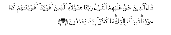63. Qala allatheena haqqa AAalayhimu alqawlu rabbana haola-i allatheena aghwayna aghwaynahum kama ghawayna tabarra/na ilayka ma kanoo iyyana yaAAbudoona
