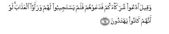 64. Waqeela odAAoo shurakaakum fadaAAawhum falam yastajeeboo lahum waraawoo alAAathaba law annahum kanoo yahtadoona