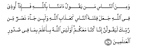 10. Wamina alnnasi man yaqoolu amanna biAllahi fa-itha oothiya fee Allahi jaAAala fitnata alnnasi kaAAathabi Allahi wala-in jaa nasrun min rabbika layaqoolunna inna kunna maAAakum awa laysa Allahu bi-aAAlama bima fee sudoori alAAalameena