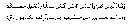 12. Waqala allatheena kafaroo lillatheena amanoo ittabiAAoo sabeelana walnahmil khatayakum wama hum bihamileena min khatayahum min shay-in innahum lakathiboona