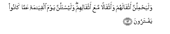 13. Walayahmilunna athqalahum waathqalan maAAa athqalihim walayus-alunna yawma alqiyamati AAamma kanoo yaftaroona