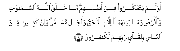 8. Awa lam yatafakkaroo fee anfusihim ma khalaqa Allahu alssamawati waal-arda wama baynahuma illa bialhaqqi waajalin musamman wa-inna katheeran mina alnnasi biliqa-i rabbihim lakafiroona