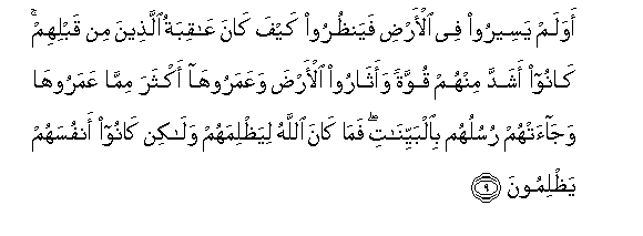 9. Awa lam yaseeroo fee al-ardi fayanthuroo kayfa kana AAaqibatu allatheena min qablihim kanoo ashadda minhum quwwatan waatharoo al-arda waAAamarooha akthara mimma AAamarooha wajaat-hum rusuluhum bialbayyinati fama kana Allahu liyathlimahum walakin kanoo anfusahum yathlimoona
