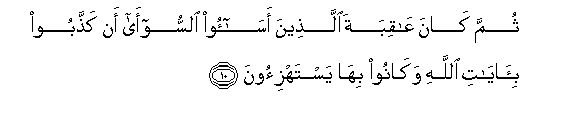 10. Thumma kana AAaqibata allatheena asaoo alssoo-a an kaththaboo bi-ayati Allahi wakanoo biha yastahzi-oona