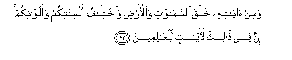 22. Wamin ayatihi khalqu alssamawati waal-ardi waikhtilafu alsinatikum waalwanikum inna fee thalika laayatin lilAAalimeena