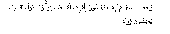 24. WajaAAalna minhum a-immatan yahdoona bi-amrina lamma sabaroo wakanoo bi-ayatina yooqinoona