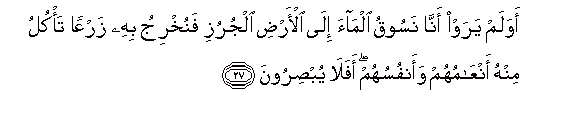 27. Awa lam yaraw anna nasooqu almaa ila al-ardi aljuruzi fanukhriju bihi zarAAan ta-kulu minhu anAAamuhum waanfusuhum afala yubsiroona