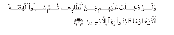 14. Walaw dukhilat AAalayhim min aqtariha thumma su-iloo alfitnata laatawha wama talabbathoo biha illa yaseeran