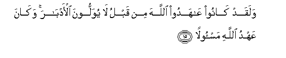 15. Walaqad kanoo AAahadoo Allaha min qablu la yuwalloona al-adbara wakana AAahdu Allahi mas-oolan
