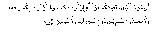 17. Qul man tha allathee yaAAsimukum mina Allahi in arada bikum soo-an aw arada bikum rahmatan wala yajidoona lahum min dooni Allahi waliyyan wala naseeran