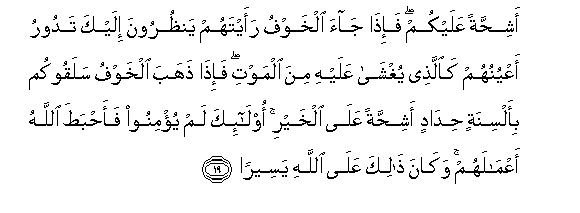 19. Ashihhatan AAalaykum fa-itha jaa alkhawfu raaytahum yanthuroona ilayka tadooru aAAyunuhum kaallathee yughsha AAalayhi mina almawti fa-itha thahaba alkhawfu salaqookum bi-alsinatin hidadin ashihhatan AAala alkhayri ola-ika lam yu/minoo faahbata Allahu aAAmalahum wakana thalika AAala Allahi yaseeran