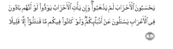 20. Yahsaboona al-ahzaba lam yathhaboo wa-in ya/ti al-ahzabu yawaddoo law annahum badoona fee al-aAArabi yas-aloona AAan anba-ikum walaw kanoo feekum ma qataloo illa qaleelan
