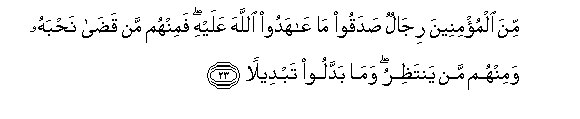 23. Mina almu/mineena rijalun sadaqoo ma AAahadoo Allaha AAalayhi faminhum man qada nahbahu waminhum man yantathiru wama baddaloo tabdeelan