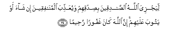 24. Liyajziya Allahu alssadiqeena bisidqihim wayuAAaththiba almunafiqeena in shaa aw yatooba AAalayhim inna Allaha kana ghafooran raheeman