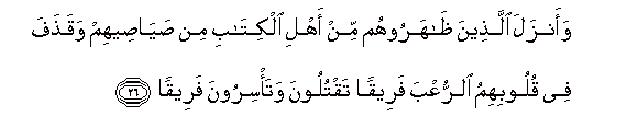 26. Waanzala allatheena thaharoohum min ahli alkitabi min sayaseehim waqathafa fee quloobihimu alrruAAba fareeqan taqtuloona wata/siroona fareeqan