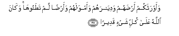 27. Waawrathakum ardahum wadiyarahum waamwalahum waardan lam tataooha wakana Allahu AAala kulli shay-in qadeeran