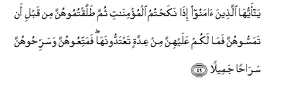 49. Ya ayyuha allatheena amanoo itha nakahtumu almu/minati thumma tallaqtumoohunna min qabli an tamassoohunna fama lakum AAalayhinna min AAiddatin taAAtaddoonaha famattiAAoohunna wasarrihoohunna sarahan jameelan