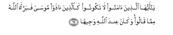 69. Ya ayyuha allatheena amanoo la takoonoo kaallatheena athaw moosa fabarraahu Allahu mimma qaloo wakana AAinda Allahi wajeehan