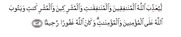 73. LiyuAAaththiba Allahu almunafiqeena waalmunafiqati waalmushrikeena waalmushrikati wayatooba Allahu AAala almu/mineena waalmu/minati wakana Allahu ghafooran raheeman