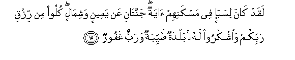 15. Laqad kana lisaba-in fee maskanihim ayatun jannatani AAan yameenin washimalin kuloo min rizqi rabbikum waoshkuroo lahu baldatun tayyibatun warabbun ghafoorun