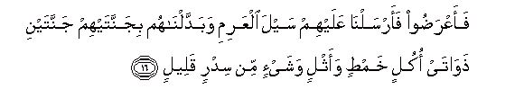 16. FaaAAradoo faarsalna AAalayhim sayla alAAarimi wabaddalnahum bijannatayhim jannatayni thawatay okulin khamtin waathlin washay-in min sidrin qaleelin