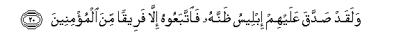 20. Walaqad saddaqa AAalayhim ibleesu thannahu faittabaAAoohu illa fareeqan mina almu/mineena