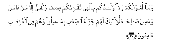 37. Wama amwalukum wala awladukum biallatee tuqarribukum AAindana zulfa illa man amana waAAamila salihan faola-ika lahum jazao alddiAAfi bima AAamiloo wahum fee alghurufati aminoona