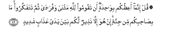 46. Qul innama aAAithukum biwahidatin an taqoomoo lillahi mathna wafurada thumma tatafakkaroo ma bisahibikum min jinnatin in huwa illa natheerun lakum bayna yaday AAathabin shadeedin