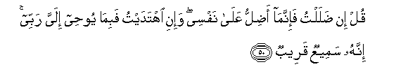50. Qul in dalaltu fa-innama adillu AAala nafsee wa-ini ihtadaytu fabima yoohee ilayya rabbee innahu sameeAAun qareebun