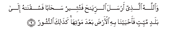 9. WaAllahu allathee arsala alrriyaha fatutheeru sahaban fasuqnahu ila baladin mayyitin faahyayna bihi al-arda baAAda mawtiha kathalika alnnushooru