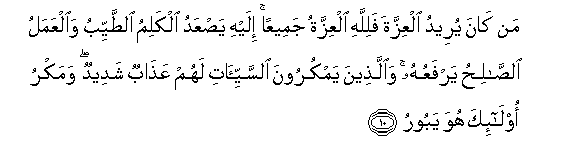10. Man kana yureedu alAAizzata falillahi alAAizzatu jameeAAan ilayhi yasAAadu alkalimu alttayyibu waalAAamalu alssalihu yarfaAAuhu waallatheena yamkuroona alssayyi-ati lahum AAathabun shadeedun wamakru ola-ika huwa yabooru