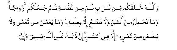 11. WaAllahu khalaqakum min turabin thumma min nutfatin thumma jaAAalakum azwajan wama tahmilu min ontha wala tadaAAu illa biAAilmihi wama yuAAammaru min muAAammarin wala yunqasu min AAumurihi illa fee kitabin inna thalika AAala Allahi yaseerun