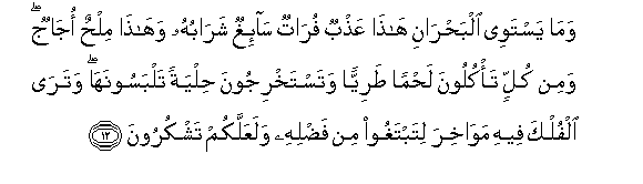 12. Wama yastawee albahrani hatha AAathbun furatun sa-ighun sharabuhu wahatha milhun ojajun wamin kullin ta/kuloona lahman tariyyan watastakhrijoona hilyatan talbasoonaha watara alfulka feehi mawakhira litabtaghoo min fadlihi walaAAallakum tashkuroona