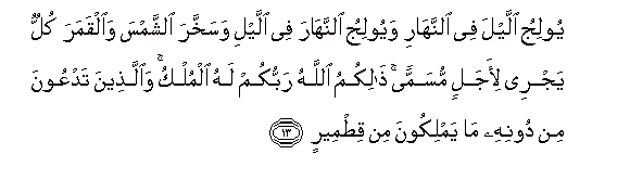13. Yooliju allayla fee alnnahari wayooliju alnnahara fee allayli wasakhkhara alshshamsa waalqamara kullun yajree li-ajalin musamman thalikumu Allahu rabbukum lahu almulku waallatheena tadAAoona min doonihi ma yamlikoona min qitmeerin