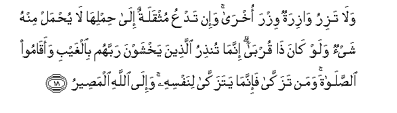 18. Wala taziru waziratun wizra okhra wa-in tadAAu muthqalatun ila himliha la yuhmal minhu shay-on walaw kana tha qurba innama tunthiru allatheena yakhshawna rabbahum bialghaybi waaqamoo alssalata waman tazakka fa-innama yatazakka linafsihi wa-ila Allahi almaseeru