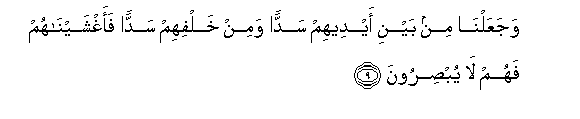 9. WajaAAalna min bayni aydeehim saddan wamin khalfihim saddan faaghshaynahum fahum la yubsiroona