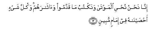 12. Inna nahnu nuhyee almawta wanaktubu ma qaddamoo waatharahum wakulla shay-in ahsaynahu fee imamin mubeenin