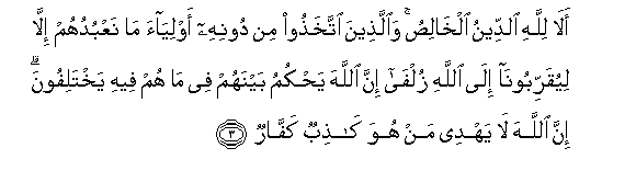 3. Ala lillahi alddeenu alkhalisu waallatheena ittakhathoo min doonihi awliyaa ma naAAbuduhum illa liyuqarriboona ila Allahi zulfa inna Allaha yahkumu baynahum fee ma hum feehi yakhtalifoona inna Allaha la yahdee man huwa kathibun kaffarun