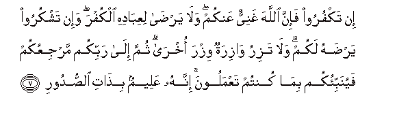 7. In takfuroo fa-inna Allaha ghaniyyun AAankum wala yarda liAAibadihi alkufra wa-in tashkuroo yardahu lakum wala taziru waziratun wizra okhra thumma ila rabbikum marjiAAukum fayunabbi-okum bima kuntum taAAmaloona innahu AAaleemun bithati alssudoori